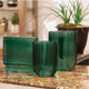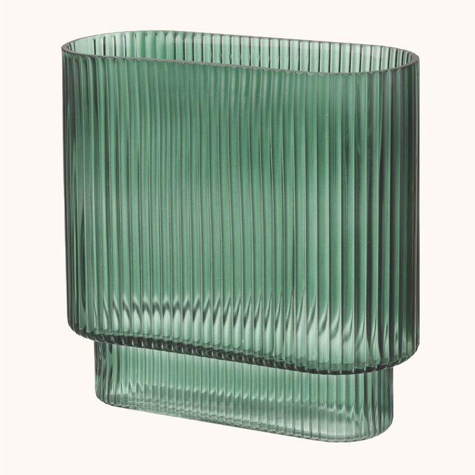 Vases are made from beautiful emerald green colored glass. Art Deco inspired etched curves add texture and dimension to these unique pieces. Use to display fresh flowers, found objects and treasures, or display alone as modern sculpture.