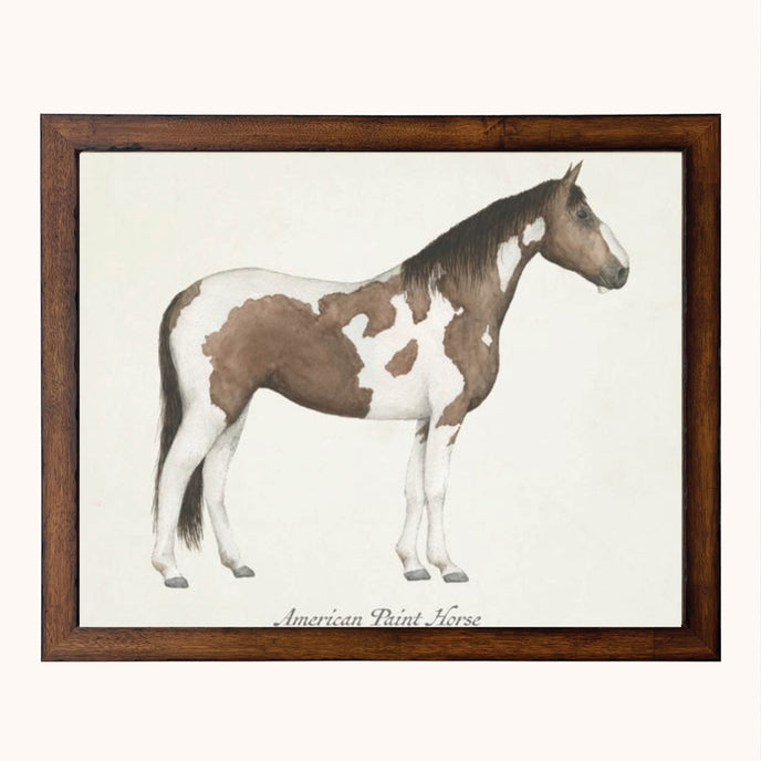 Framed 20" x 16" american paint horse print, made to order in the USA. Each piece is handcrafted using light walnut flat frame, glass covers, and mounting hardware. You will receive tracking information when your product ships in 3-4 weeks.
