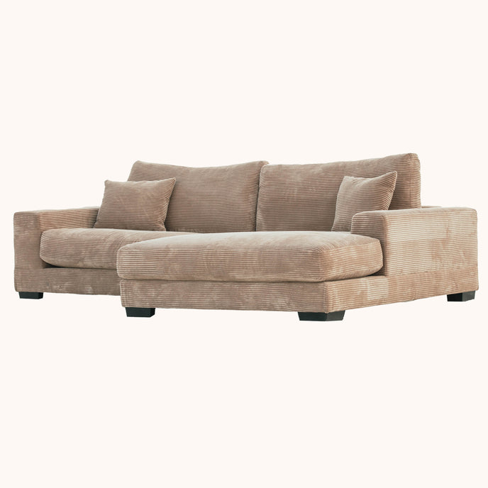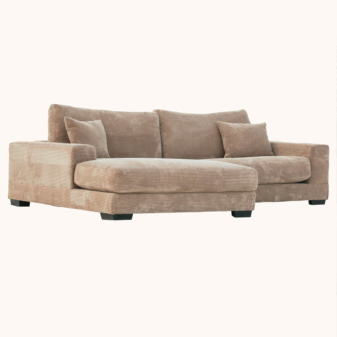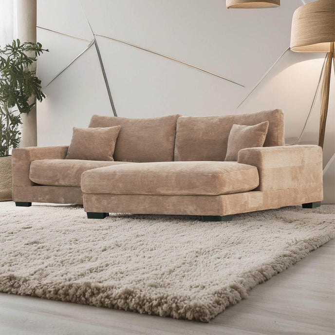 The Goodnight corded microfiber sectional is the perfect binge-watching sofa. Its cozy and plush, with extra wide seats made with pocketed coil cushions with high density foam overlay. This unique corded upholstered piece is built on a sturdy solid kiln-dried hardwood base. The extra wide chaise makes for a comfortable nap space for one or more! The goodnight is modular, accommodating a variety of spaces and ideal configurations, right and left facing, or both! Fully reversible cushions.