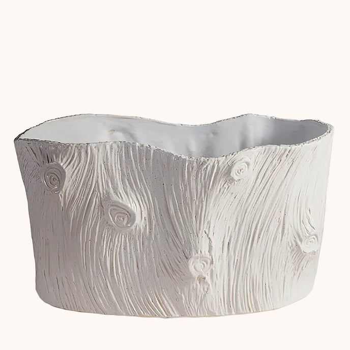 Our gorgeous mod faux bois is truly the next level in artisinal white ceramic. Handcrafted by skilled artisans, each piece is an original and varies in size and color. Dust with dry cloth. Protect fine furniture by lining the interior of the pottery when necessary.
