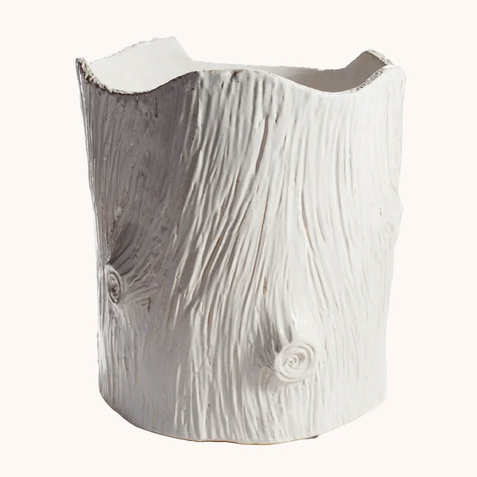 Our gorgeous mod faux bois is truly the next level in artisinal white ceramic. Handcrafted by skilled artisans, each piece is an original and varies in size and color. Dust with dry cloth. Protect fine furniture by lining the interior of the pottery when necessary.