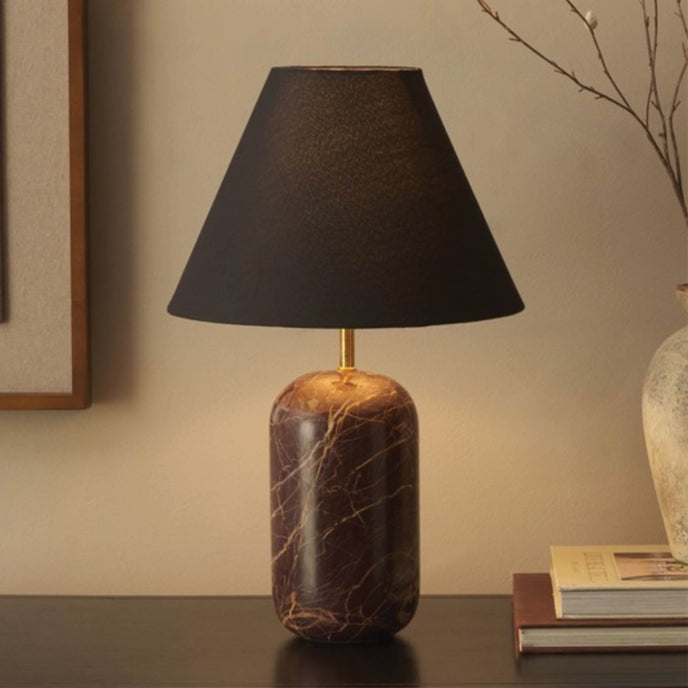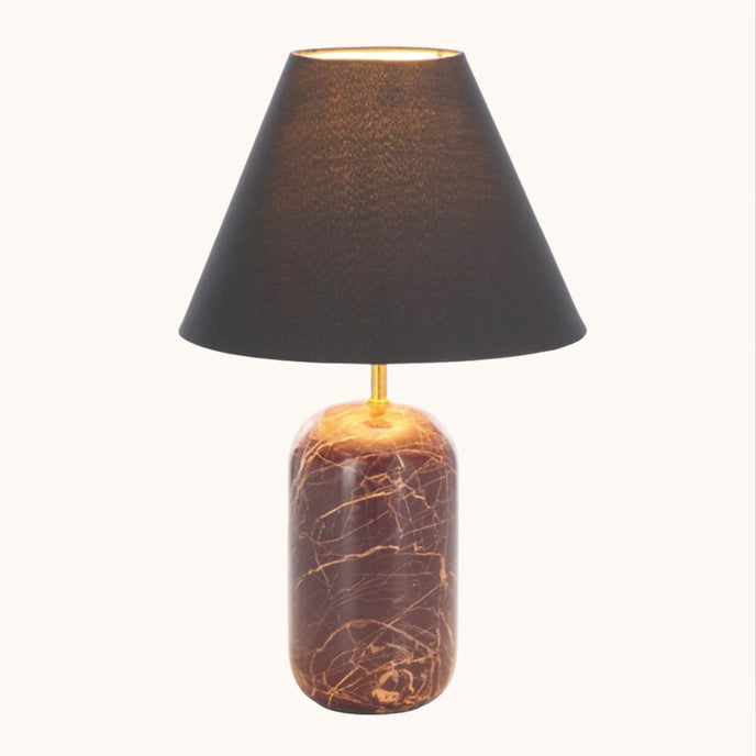 This table lamp features a red marble body that brings a touch of elegance and warmth to any room. The marble base exudes a natural beauty, making each piece distinct. Topped with a fabric shade, it filters light perfectly to create a cozy and inviting atmosphere.